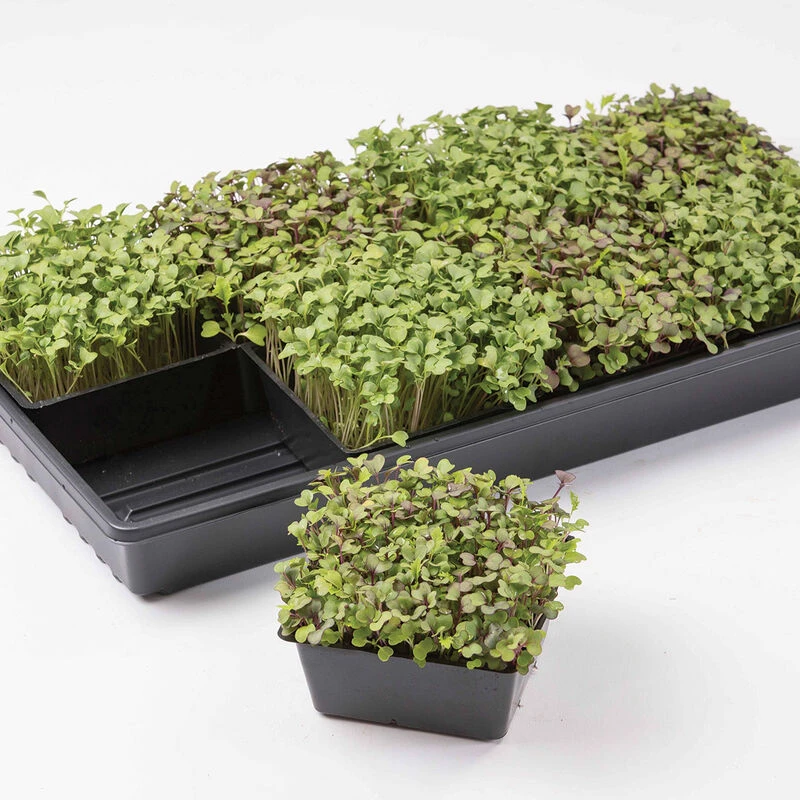 Lightweight thermoform plastic inserts perfect for direct sales to chefs or for staggering small microgreen plantings for continuous harvest. Each flat splits into (8) 5″ x 5″ containers which fill standard 1020 trays. NOTE: Must be used with a leakproof 1020 bottom tray or mesh tray. Dimensions: 21.5″ L x 10.5″ W x 2.5″ H. Quantity: 5 flats.