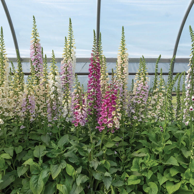 A combination of four lovely colors: cream, lavender, rose, and white. Center spikes are large and full, and side shoots fill out the plant. Great for bouquets and gardens. Best when treated as a fall or spring-planted hardy annual, as winter survival is generally poor when treated as a perennial. Also known as purple foxglove. Pelleted seeds.