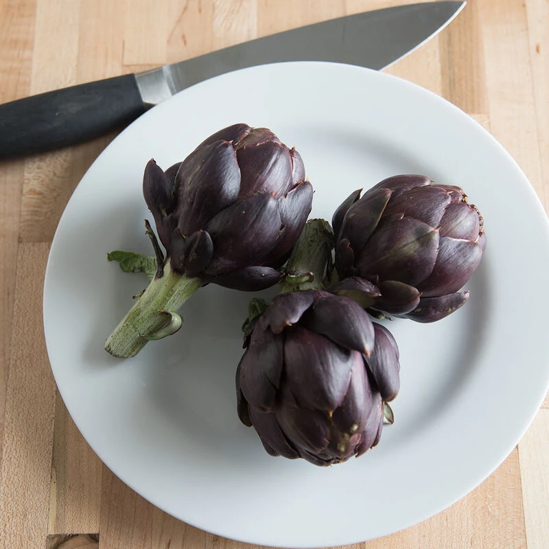 A very early artichoke specifically bred for annual production from seed. The 1–3′ tall plants vary from upright to prostrate, but all produce high yields of purple to greenish-purple buds. Typically 1–3 primary buds are produced that are 2 1/2–3 1/2″ in diameter followed by 5–7 secondary buds ranging from 2–2 1/2″ in diameter. Developed by Keith Mayberry, who also bred Imperial Star. Plants are spiny. Perennialization possible in Zone 9 and warmer; otherwise treat as an annual. NOTE: Amount of purpling may vary from plant to plant; some buds will be all purple, while others only show purple-tinged bracts.