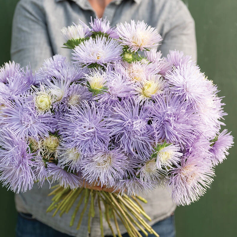4–6″ wide, silvery-lilac blooms open with a creamy colored center, darkening to lilac-blue as blooms mature. Long, sturdy stems. Easy to harvest due to the well-branched plant’s open and airy habit. Similar to the Valkyrie series in general performance and plant habit. Long vase life. Also known as summer aster.
