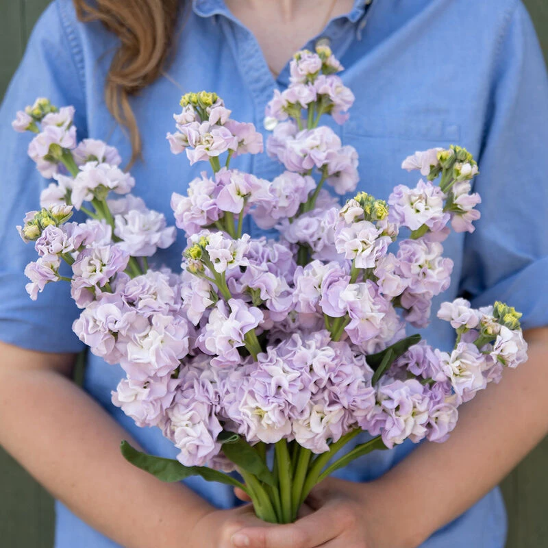 Early single-stem, or column-type stock in a highly uniform series for one-cut harvest. Aptly named for strong, straight, rigid stems. Iron performed well in our spring, early summer, and fall trials. Selectable for doubles and 55% double without selection. Compared to Katz, Iron is slightly later to flower, and has somewhat shorter and thicker stems. Tightly spaced florets on the flower spike make for compact 1 1/2–2″, pale lavender-blue blooms with a full appearance. NOTE: This variety produces one flowering stem per plant. Pinching is not advisable as it will terminate flowering.