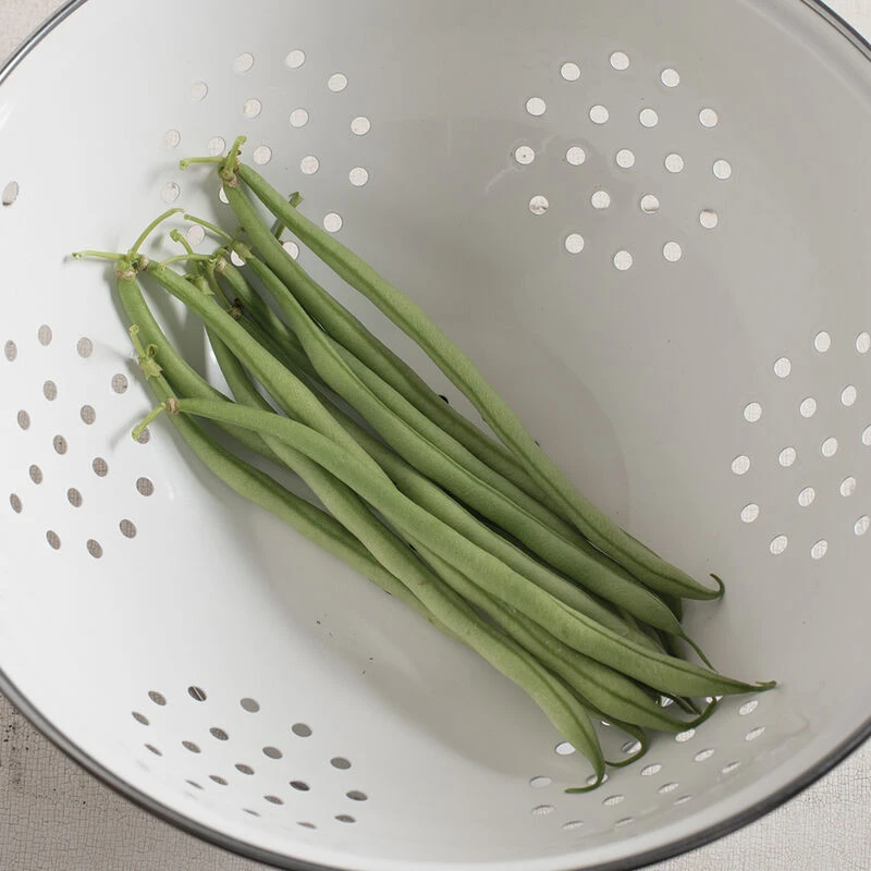 High yields of slender, 7″ green pods. Extended pod set. Brown mottled seeds. Bush bean.