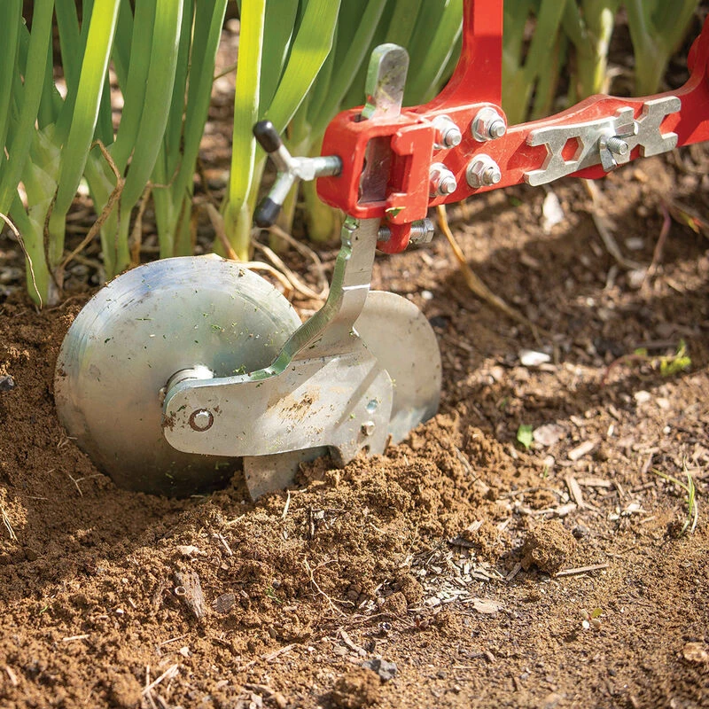 Two angled discs accurately throw soil against plant stems. Hill one side of the row at a time for crops too tall to straddle with Bio-Discs or a double wheel hoe. Left-pulling. Right-pulling model also available. Made in France by Terrateck.