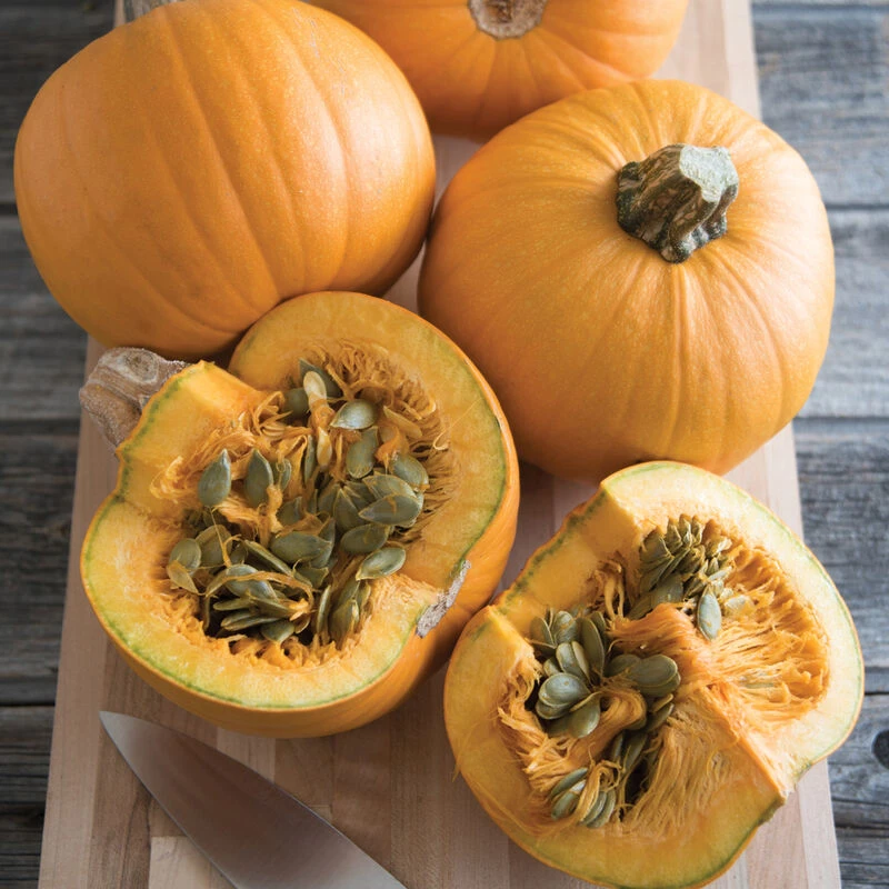Naked Bear’s smaller, but more abundant fruit produce higher seed yields than those of traditional hulless pumpkins. Harvest for flavorful pepitas. The semi-hulless seeds are excellent for roasting and snacking, and can be pressed for oil. Uniform and avg. 2–4 lb., its light orange fruits with gold flecking also make attractive ornamentals. From our experience, Naked Bear will yield a crop even under strong disease pressure. Also available treated.