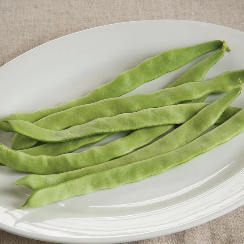 This early maturing Roma-type pole bean has a deliciously rich, sweet flavor. The 8″ long, 1″ wide, flat green pods are stringless and stay tender for long periods. Extra vigorous in the seedling stage with strong vine growth. white seeds. Pole bean; requires trellising. USDA Certified Organic.