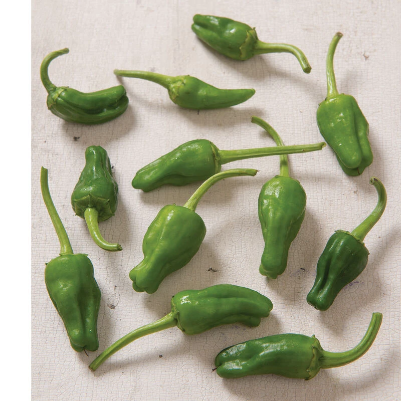 Named after the town where they originated. Harvest Padron peppers when they are 1–1 1/2″ long. About 1 out of 20 fruits will be hot, and the rest mild. All the fruits become hot if allowed to grow 2–3″ long. Typically sautéed in olive oil with a little sea salt and eaten as tapas (appetizers) in Spain. USDA Certified Organic.