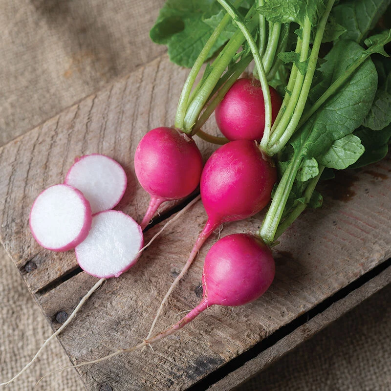 Uniform roots, medium tops. With crisp texture and sweetness balanced with delicate spice, Pink Beauty eats better than just about any other radish we’ve tried. An eye-catching, attractive pink radish. Resists pithiness. USDA Certified Organic.