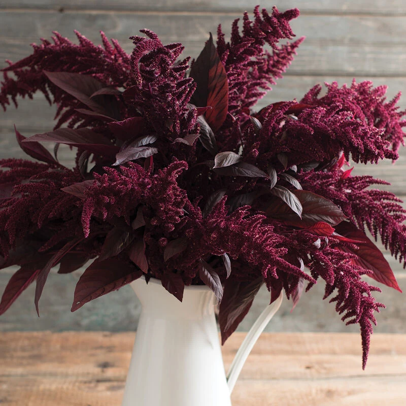 Ideal color and form for late summer and fall arrangements. More useful than other upright types because of its gracefully arched, feathery plumes. Dark red, arched, and airy flower heads. When plants are young and leaves are tender, the foliage makes a nice edible green. Also known simply as amaranth.