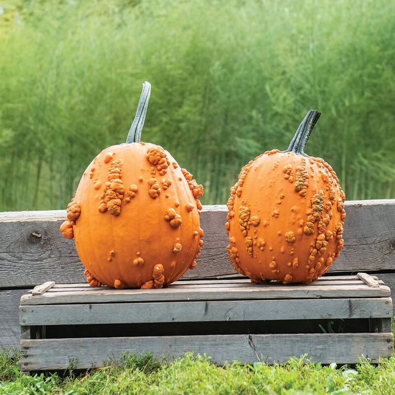 Ghoulish pumpkin with a nice, upright shape and durable handle. Very similar to Knuckle Head, which it replaced. Long vines. Avg. weight: 15–20 lb.