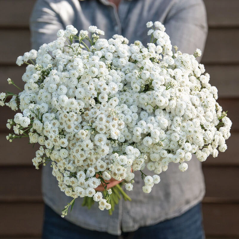 Small clusters of ½” double-white flowers on sturdy, durable stems. Highly productive plants produce multiple cuts, especially in the second year of production, as plants are taller and more vigorous in the second year. Appearance is reminiscent of baby’s breath and feverfew. Typically blooming later in the summer, The Pearl can be used as a mid- and late-season substitute for feverfew. Plants will produce two flushes of stems and blooms if cut back within a few inches of the ground, after the first round of flowers. Excellent cut flower and reliable perennial garden plant. Tolerates heat and low-water growing environments once established. Perennial in Zones 3–9.
